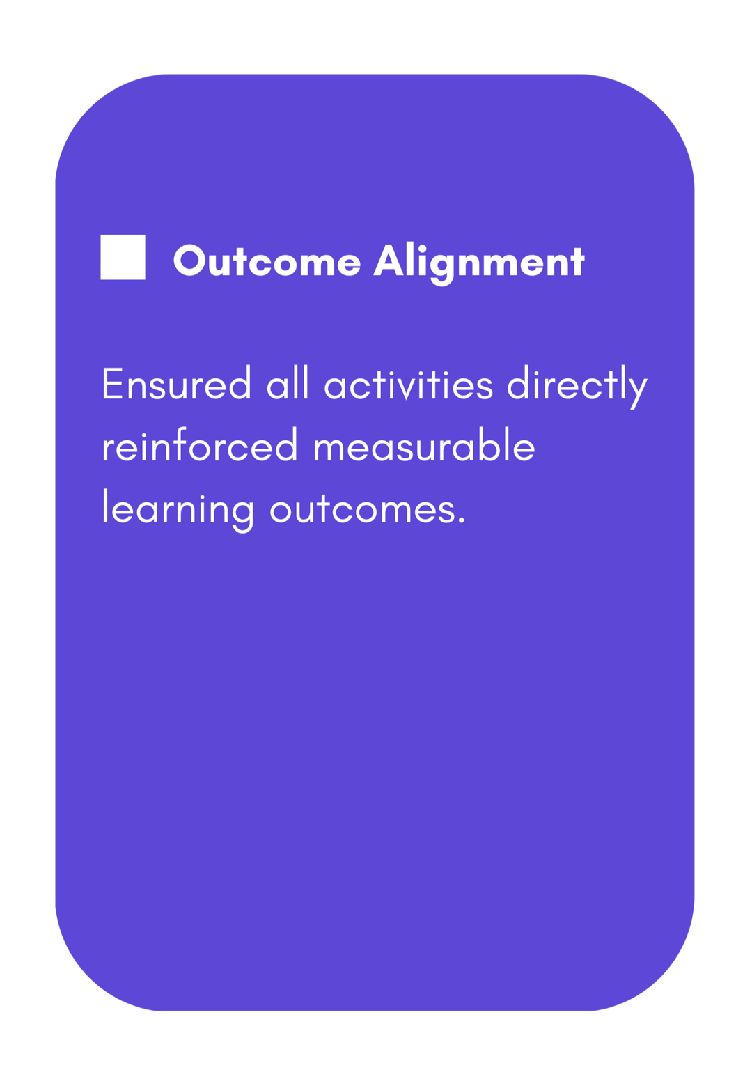| 4. Weak outcome alignment ➜ Activities not tied to outcomes ➜ Skills unclear after completion ➜ Limited real-world transfer | ➜ Mapped exercises to learning outcomes ➜ Added practical, applied tasks ➜ Reinforced measurable skill development |