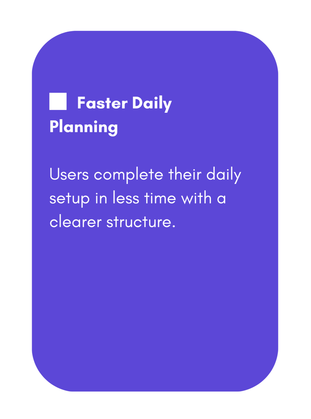 | 1. Cluttered, unclear layout ➜ Cluttered sections unclear ➜ Hard to track daily priorities ➜ Design lacked visual hierarchy. | ➜ Introduced structured spacing to separate functional sections. ➜ Added clear labels to improve quick scanning. ➜ Applied visual hierarchy to highlight priorities |